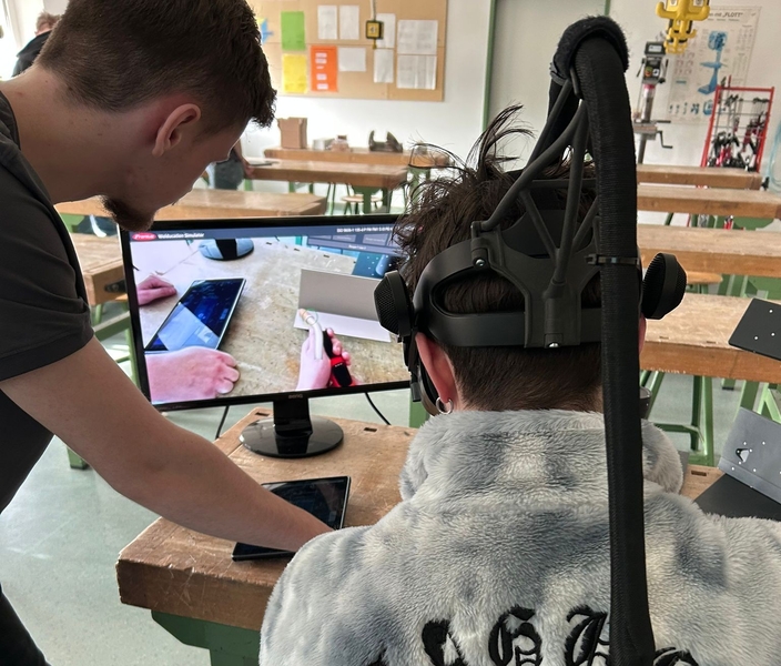 Ein weiteres Highlight war der Einsatz eines modernen Welding-Simulators. Bei diesem hochkomplexen Schweißsimulator konnten die Schüler mit VR-Brille wie an echtem Metall schweißen. In geteilten Gruppen arbeiteten sie abwechselnd am Montageprojekt weiter und sammelten gleichzeitig erste Erfahrungen im Schweißen – ganz ohne Gefahr, aber mit realistischem Gefühl.